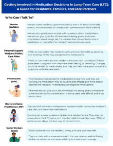 This resource explains the ways LTC team members are involved with medications to help residents, families, and caregivers know who to reach out to if they have any questions. The tool was requested by families who attended our Talking About Medications workshops. It was developed in partnership with our LTC Stakeholder Advisory Group and critically reviewed by LTC caregivers (Robert Patzer and Connie Newman).