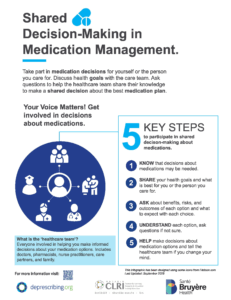 This Shared Decision-Making in Medication Management Infographic summarizes the key steps from the guide in poster/handout format to serve as a visual reminder for everyone on the resident’s care team. It encourages residents and their families to take part in conversations about medications and reminds healthcare providers and staff about the steps in the guide.