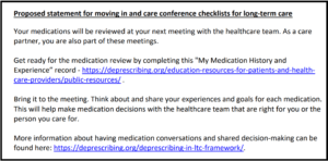 The proposed Statement for Admissions and Care Conferences Checklists is a way for LTC homes to encourage residents and their families to prepare for, and engage in, conversations about their medications upon admission to the home and during care conferences. This statement is an example of text that can be included in a LTC home’s admission and care conference checklists.