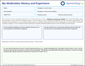 The Fillable Medication Record and Experience Form helps residents and their families share details about their medication history and experience. This form can be provided to residents and their families as people are moving into LTC so they can fill it out and provide the care team with as much information as possible. Having an up-to-date list of medications can help residents and their care team use shared decision-making to make choices about their medications.